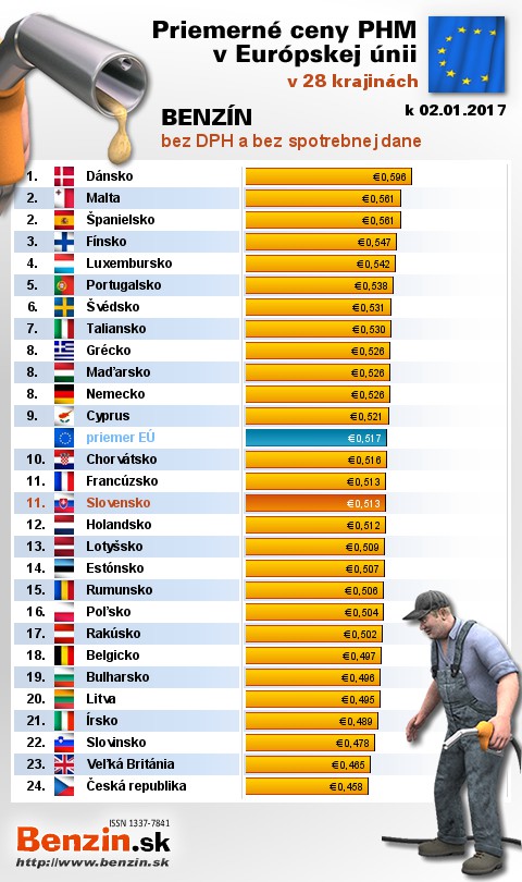 Na Slovensku sme tankovali 14. najlacnejší benzín bez dane v EÚ za priemernú cenu: 0,513 EUR za 1L.