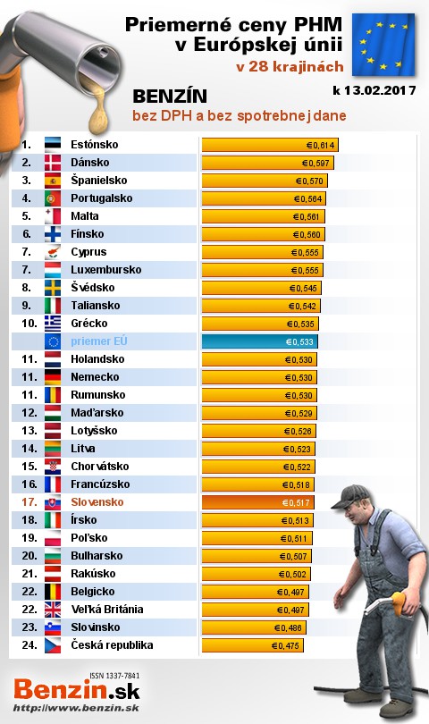 Na Slovensku sme tankovali 8. najlacnejší benzín bez dane v EÚ za priemernú cenu: 0,517 EUR za 1L.