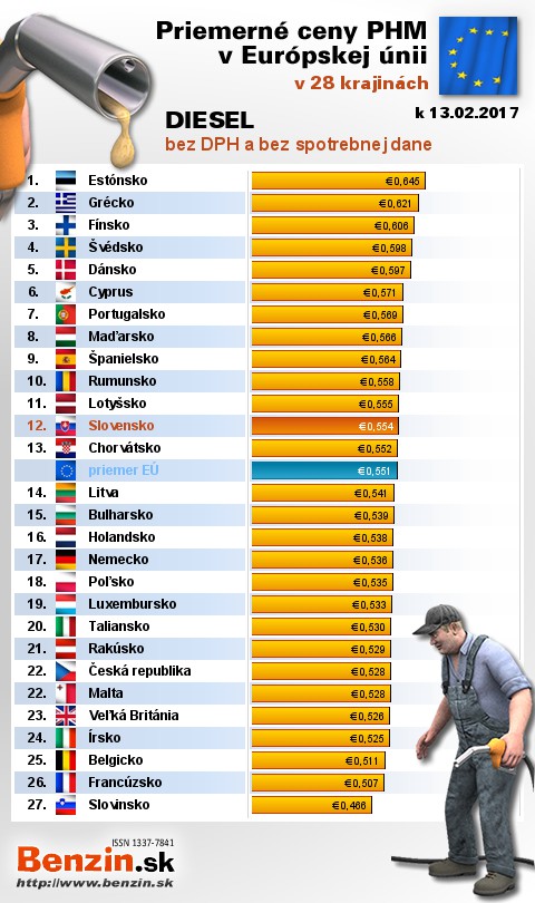 Na Slovensku čerpali motoristi 16. najlacnejšiu motorovú naftu bez dane v rámci Európy: 0,554 EUR za 1L.
