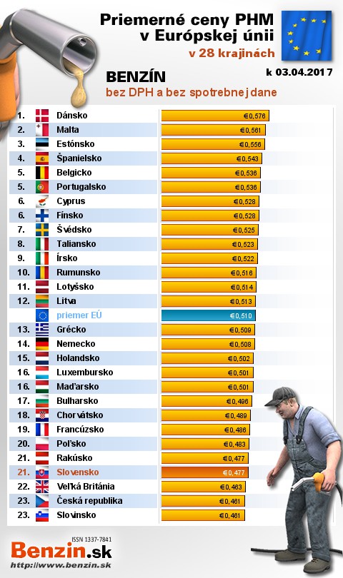 Na Slovensku sme tankovali 3. najlacnejší benzín bez dane v EÚ za priemernú cenu: 0,477 EUR za 1L.