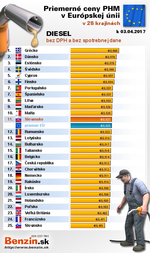 Na Slovensku čerpali motoristi 15. najlacnejšiu motorovú naftu bez dane v rámci Európy: 0,527 EUR za 1L.