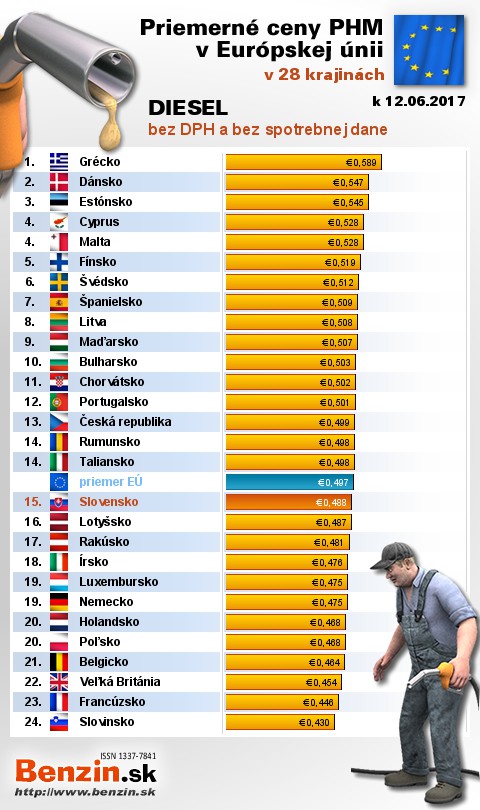 Na Slovensku čerpali motoristi 10. najlacnejšiu motorovú naftu bez dane v rámci Európy: 0,488 EUR za 1L.