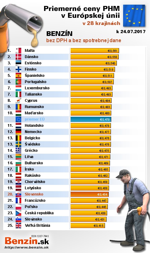 Na Slovensku sme tankovali 6. najlacnejší benzín bez dane v EÚ za priemernú cenu: 0,454 EUR za 1L.