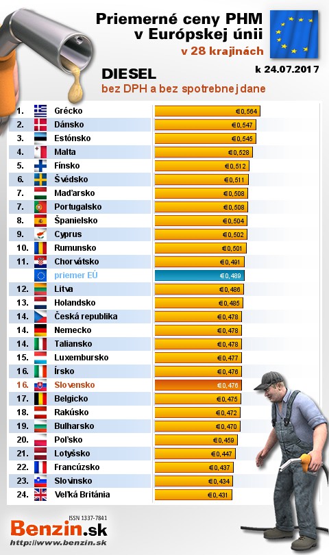 Na Slovensku čerpali motoristi 9. najlacnejšiu motorovú naftu bez dane v rámci Európy: 0,476 EUR za 1L.