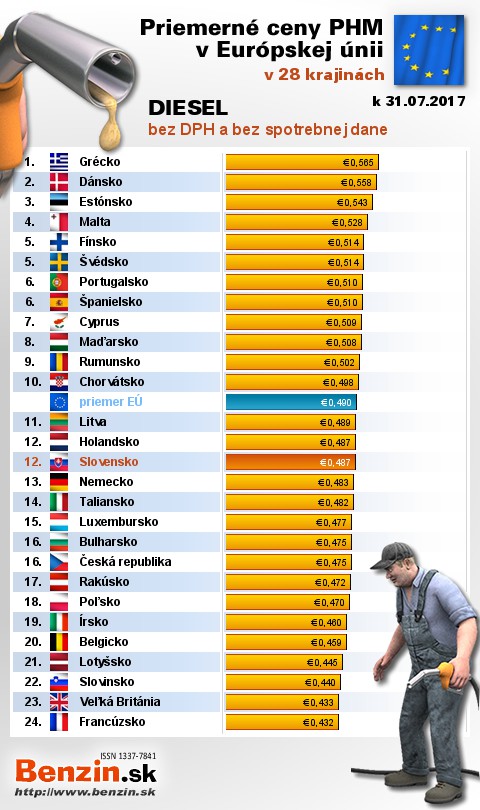 Na Slovensku čerpali motoristi 13. najlacnejšiu motorovú naftu bez dane v rámci Európy: 0,487 EUR za 1L.