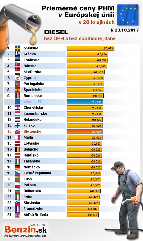 Na Slovensku čerpali motoristi 12. najlacnejšiu motorovú naftu bez dane v rámci Európy: 0,529 EUR za 1L.