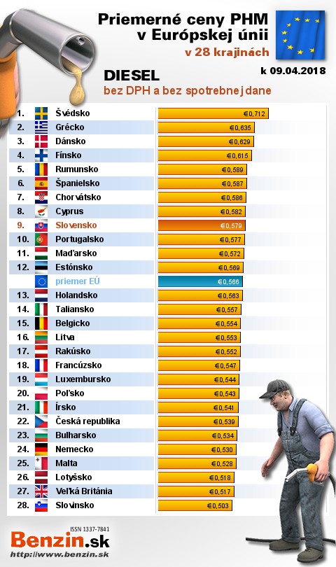 Na Slovensku čerpali motoristi 20. najlacnejšiu motorovú naftu bez dane v rámci Európy: 0,579 EUR za 1L.