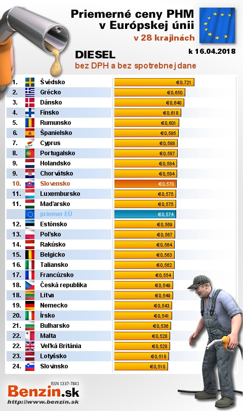 Na Slovensku čerpali motoristi 15. najlacnejšiu motorovú naftu bez dane v rámci Európy: 0,578 EUR za 1L.