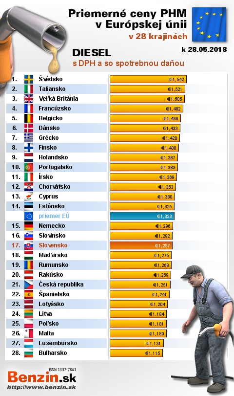 Na Slovensku čerpali motoristi 17. najdrahšiu motorovú naftu s daňou v rámci Európy: 1,287 EUR za 1L.