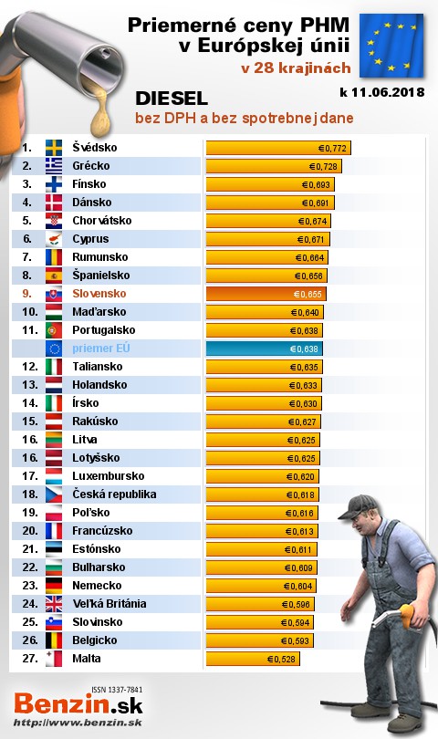 Na Slovensku čerpali motoristi 19. najlacnejšiu motorovú naftu bez dane v rámci Európy: 0,655 EUR za 1L.
