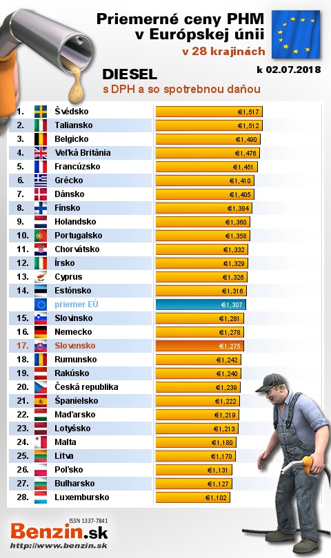 Nasledujúce údaje sú spracované podľa informácií EUROSTATU vydaných 05.07 k 02.07.2018 za obdobie v 26.týždni (od 25.06.2018 - 01.07.2018), ako ich uviedli členské štáty EU. Ceny sú uvádzané v euro. V tabuľke uvádzame štáty Európy podľa toho, za akú priemernú sumu v predchádzajúcich dňoch tankovali.