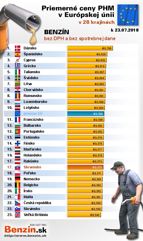 Nasledujúce údaje sú spracované podľa informácií EUROSTATU vydaných 26.07 k 23.07.2018 za obdobie v 29.týždni (od 16.07.2018 - 22.07.2018), ako ich uviedli členské štáty EU. Ceny sú uvádzané v euro. V tabuľke uvádzame štáty Európy podľa toho, za akú priemernú sumu v predchádzajúcich dňoch tankovali.