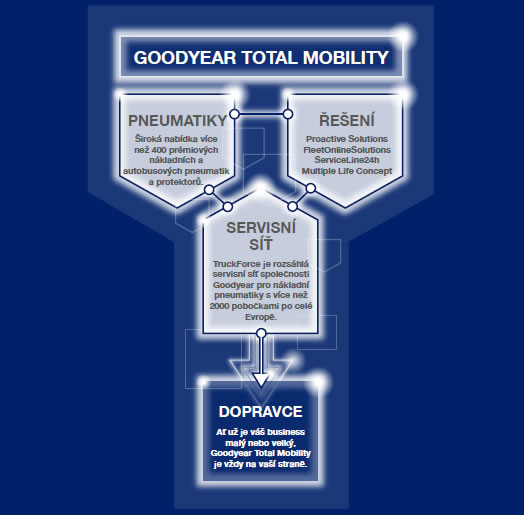 Spoločnosť Goodyear v máji predstavila svoju novú komplexnú ponuku pre dopravcov. Pod hlavičkou Goodyear Total Mobility spája celý rad prémiových nákladných pneumatík značky, sadu dátových riešení vrátane monitorovacích služieb a služieb prediktívnej analýzy a viac ako 2000 servisných miest v celej Európe.