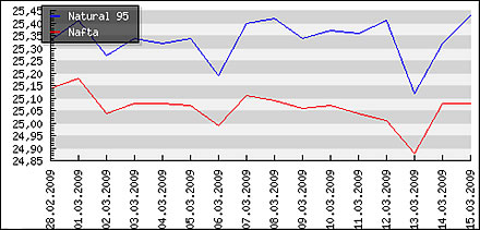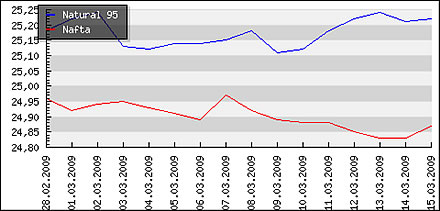 | | Nafta: | 1,474 € | | Benzin 95: | 1,491 € | | Benzin 95+: | 1,500 € | | Benzin 99+: | 1,613 € | | LPG: | 0,644 € | | AdBlue: | 0,890 € |