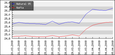| | Nafta: | 1,471 € | | Benzin 95: | 1,488 € | | Benzin 95+: | 1,499 € | | Benzin 99+: | 1,613 € | | LPG: | 0,639 € | | AdBlue: | 0,890 € |