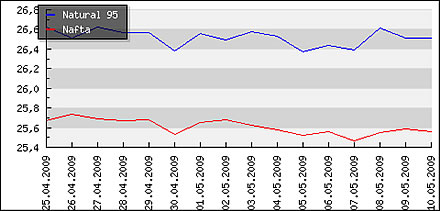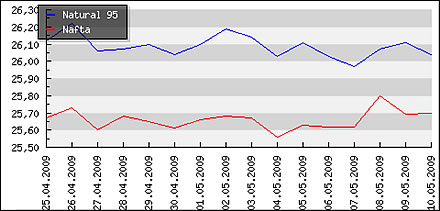 | | Nafta: | 1,471 € | | Benzin 95: | 1,488 € | | Benzin 95+: | 1,499 € | | Benzin 99+: | 1,613 € | | LPG: | 0,639 € | | AdBlue: | 0,890 € |