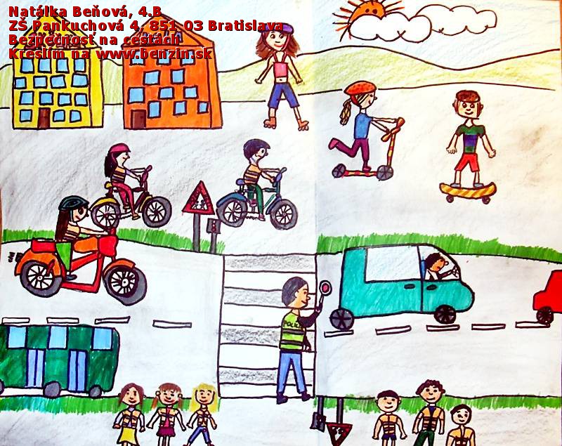 Čo alebo kto napomáha chodcom, cyklistom, autám,... (účastníkom cestnej premávky), aby sa cítili na ceste bezpečne? Sú to dopravné značky? Semafory? Oblečenie? Policajti? Priechody pre chodcov, pripútanie sa v aute, či prilba na hlave? Nakreslite, čo si prvé predstavíte pri slovnom spojení Bezpečnosť na cestách.