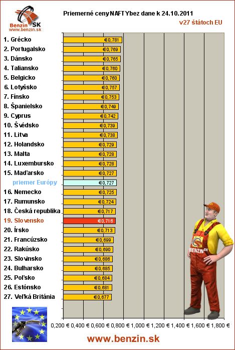 mali v Grécku, kde motoristi v priemere zaplatili 0,781 EUR za 1L.