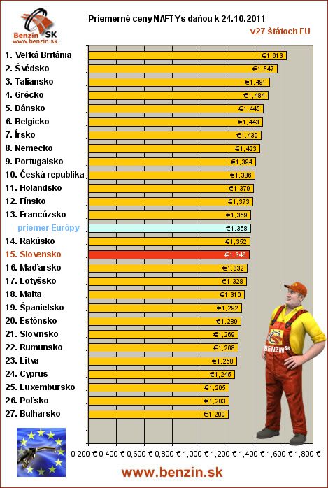 mali vo Veľkej Británii, kde motoristi v priemere zaplatili 1,613 EUR za 1L.