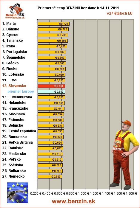 Na Slovensku sme tankovali 16. najlacnejší benzín bez dane v EÚ za priemernú cenu: 0,651 EUR za 1L.