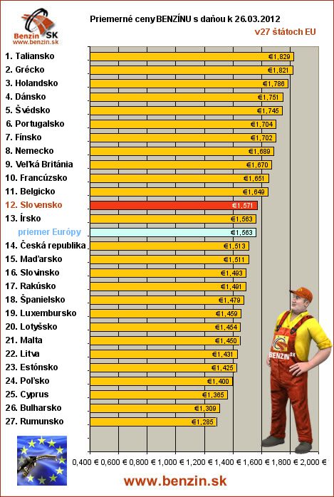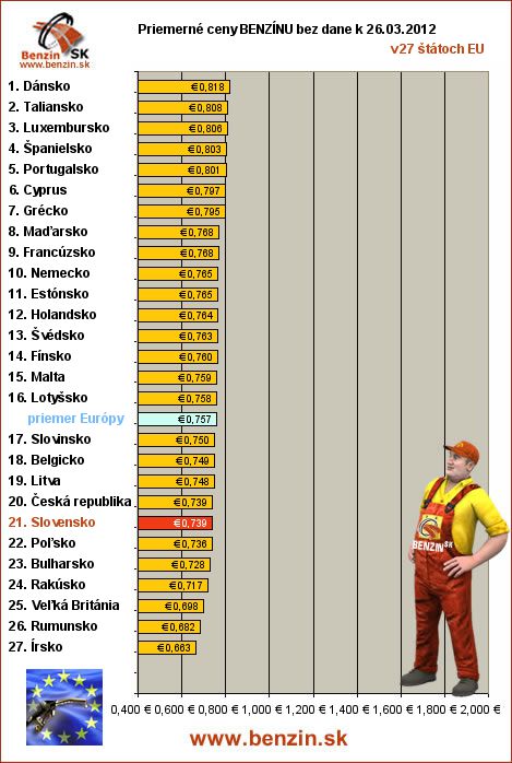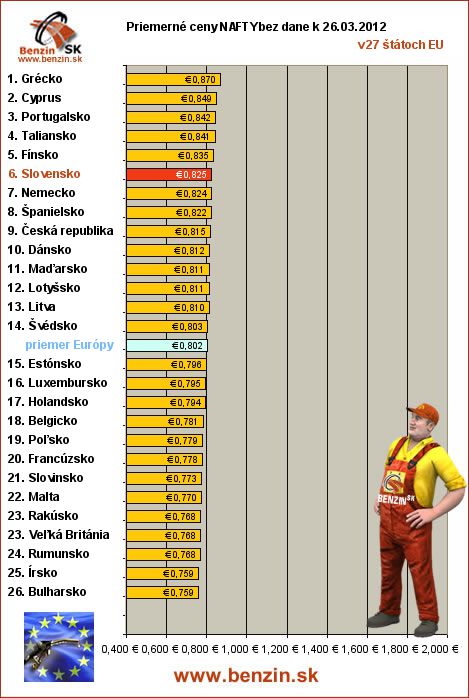 Nasledujúce údaje sú spracované podľa informácií EUROSTATU vydaných 28.03 k 26.03.2012 za obdobie v 12.týždni (od 19.03.2012 - 24.03.2012), ako ich uviedli členské štáty EU. Ceny sú uvádzané v euro. V tabuľke uvádzame štáty Európy podľa toho, za akú priemernú sumu v predchádzajúcich dňoch tankovali.