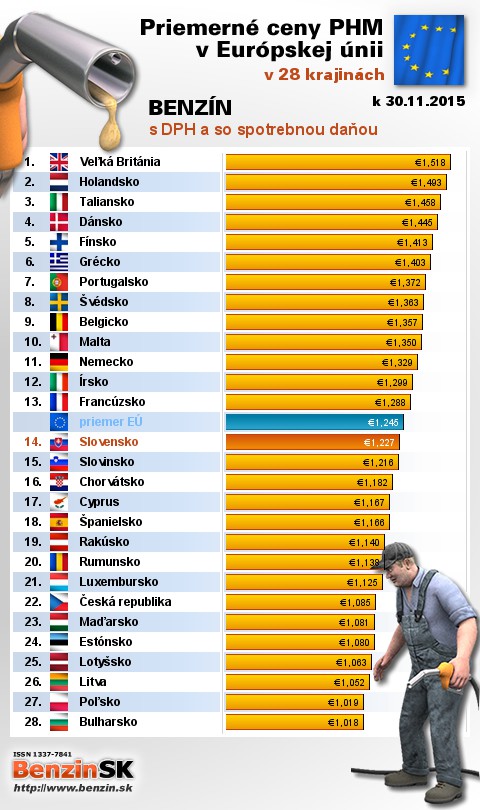 mali vo Veľkej Británii, kde motoristi v priemere zaplatili 1,518 EUR za 1L.