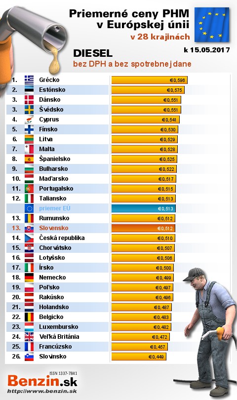 Na Slovensku čerpali motoristi 13. najlacnejšiu motorovú naftu bez dane v rámci Európy: 0,512 EUR za 1L.