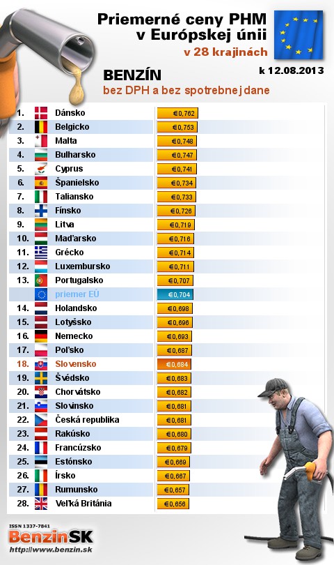 Nasledujúce údaje sú spracované podľa informácií EUROSTATU vydaných 14.08 k 12.08.2013 za obdobie v 32.týždni (od 05.08.2013 - 11.08.2013), ako ich uviedli členské štáty EU. Ceny sú uvádzané v euro. V tabuľke uvádzame štáty Európy podľa toho, za akú priemernú sumu v predchádzajúcich dňoch tankovali.