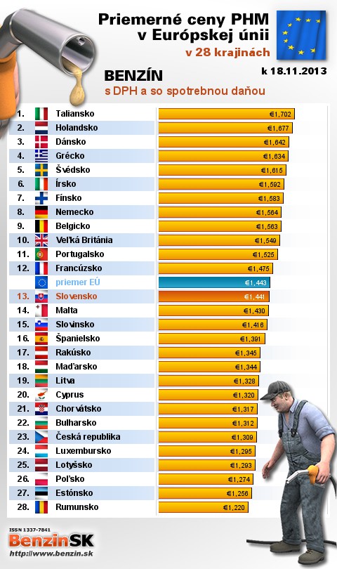 Na Slovensku sme tankovali 13. najdrahší benzín s daňou v EÚ za priemernú cenu: 1,441 EUR za 1L.