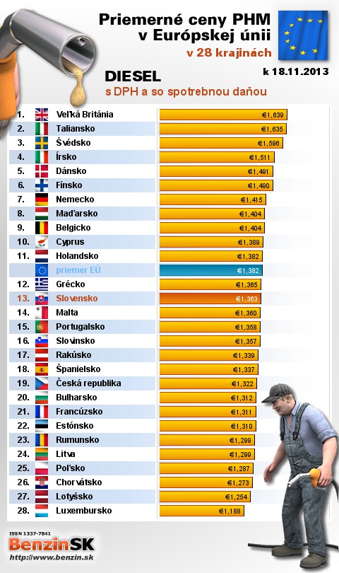 Na Slovensku čerpali motoristi 13. najdrahšiu motorovú naftu s daňou v rámci Európy: 1,363 EUR za 1L.