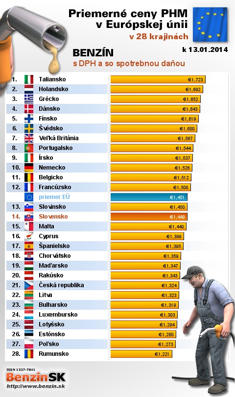 Na Slovensku sme tankovali 14. najdrahší benzín s daňou v EÚ za priemernú cenu: 1,449 EUR za 1L.