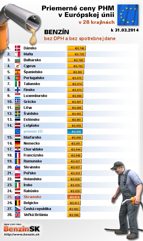 Nasledujúce údaje sú spracované podľa informácií EUROSTATU vydaných 03.04 k 31.03.2014 za obdobie v 13.týždni (od 24.03.2014 - 29.03.2014), ako ich uviedli členské štáty EU. Ceny sú uvádzané v euro. V tabuľke uvádzame štáty Európy podľa toho, za akú priemernú sumu v predchádzajúcich dňoch tankovali.