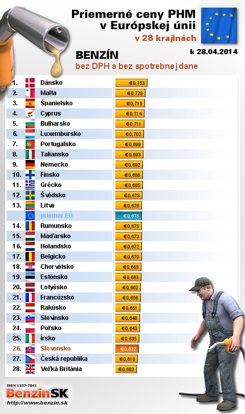 Na Slovensku sme tankovali 3. najlacnejší benzín bez dane v EÚ za priemernú cenu: 0,632 EUR za 1L.