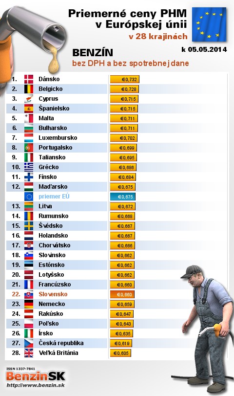 Na Slovensku sme tankovali 7. najlacnejší benzín bez dane v EÚ za priemernú cenu: 0,660 EUR za 1L.