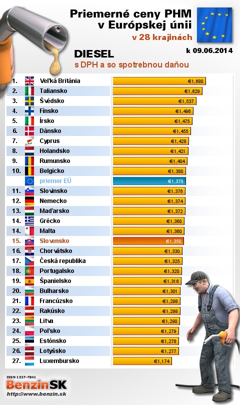 Na Slovensku čerpali motoristi 15. najdrahšiu motorovú naftu s daňou v rámci Európy: 1,350 EUR za 1L.