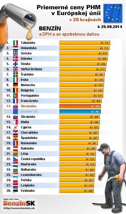 Na Slovensku sme tankovali 13. najdrahší benzín s daňou v EÚ za priemernú cenu: 1,470 EUR za 1L.