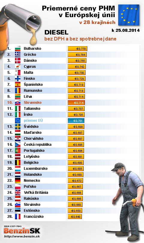 Na Slovensku čerpali motoristi 19. najlacnejšiu motorovú naftu bez dane v rámci Európy: 0,714 EUR za 1L.