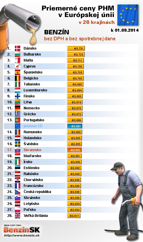 Na Slovensku sme tankovali 12. najlacnejší benzín bez dane v EÚ za priemernú cenu: 0,652 EUR za 1L.