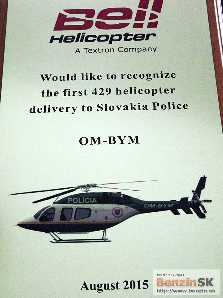 Dnes minister vnútra Róbert Kaliňák, slávnostne prebral kľúče od prvého vrtuľníku Bell-429 a pokrstil ho šumivým vínom. Ide o postupné prezbrojenie letky Ministerstva vnútra. Doteraz používali výhradne vrtuľníky len od jedného výrobcu Mil a to multifunkčný transportný vrtuľník Mi-171 (momentálne ich majú k dispozícii 4).
