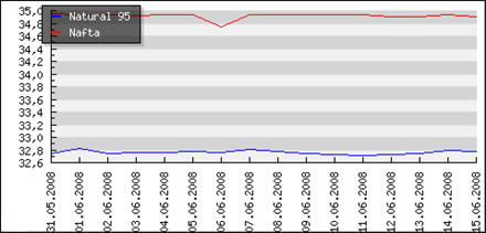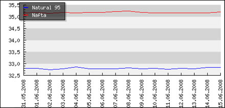 | | Nafta: | 1,790 € | | Benzin 95: | 1,714 € | | Benzin 95+: | 1,707 € | | Benzin 99+: | 1,863 € | | LPG: | 0,870 € |