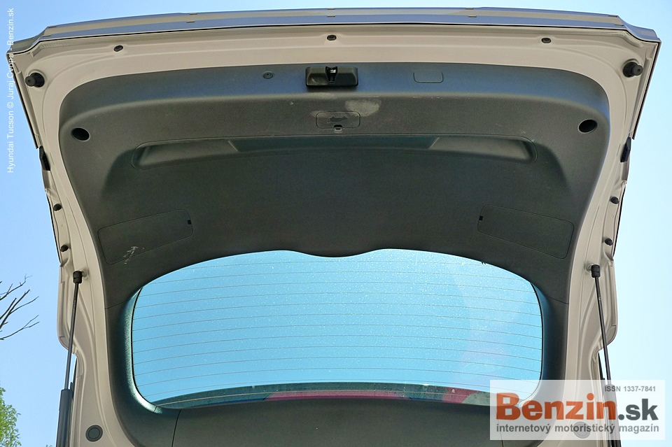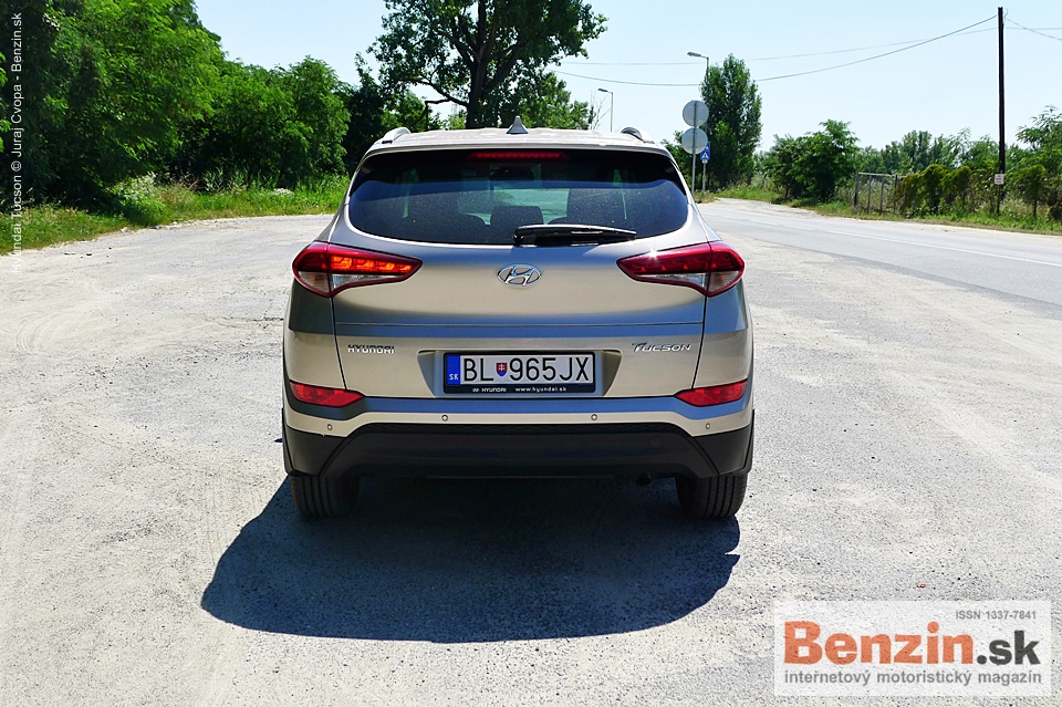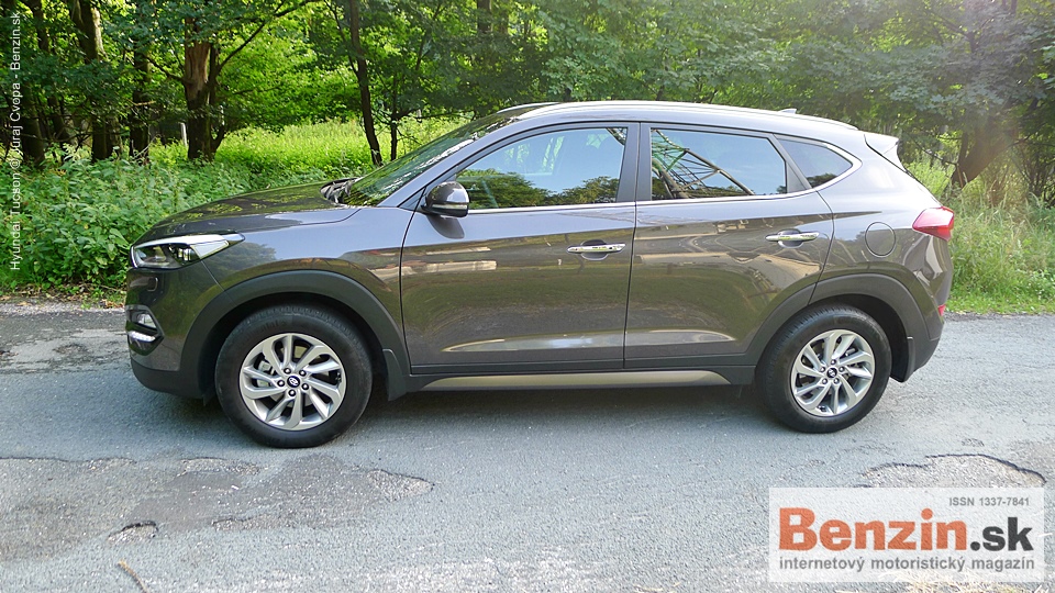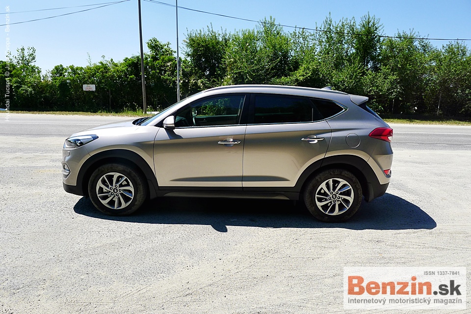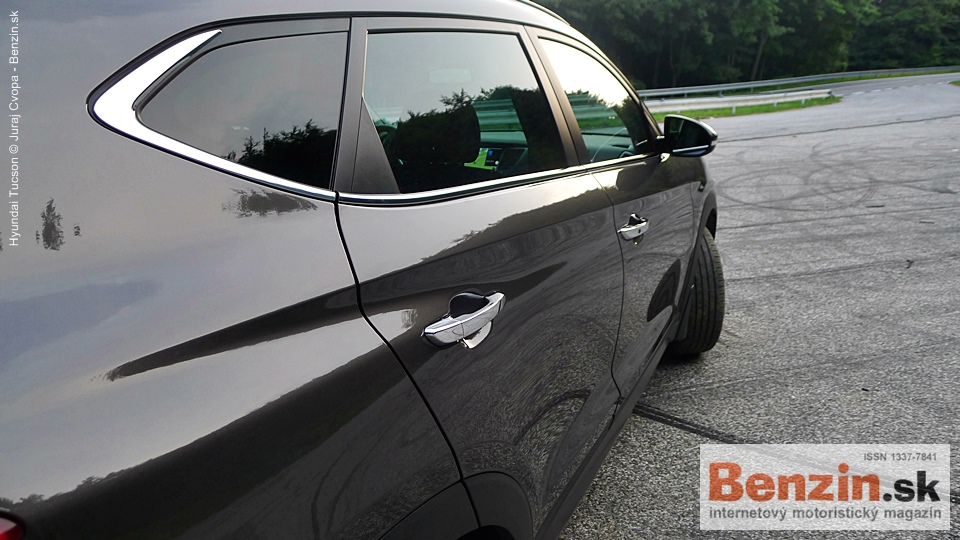 Dopyt po robustných autách s vysokou stavbou a svetlou výškou je aktuálny a Tucson z neho ťaží. Všetko, počnúc maskou chladiča s pripojenými svetlometmi, cez nadkolia až po piate dvere je napumpované, ale aj prirodzene vyvážené a na pohľad príjemné. Esteticky dôležitý uzol ”kapota – spodná hrana okien - A stĺpik” vytvára zátišie pre spätné zrkadlo a decentne odľahčuje karosársku masu. Aj musí, veď zadní cestujci sotva vidia ponad spodnú chrómovú lištu okien, ktorá smerom vzad končí v efektnej fajke. Tej zasadzuje tvarovú kontru strešný spojler s postrannými bočničkami. Bočnice vidno aj na celej spodnej časti karosérie, ako sa na módny pseudooffroad patrí. Rovný prah dosahuje optické odľahčenie lakovaním, ktoré pri výletoch po šotoline dostane zabrať. Piate dvere sa trocha hrajú na vodorovne delené, zostalo však len pri hre. Zadné partie kompozične ladia a uzatvárajú Tucson s pozitívnou dojmovou koncovkou.