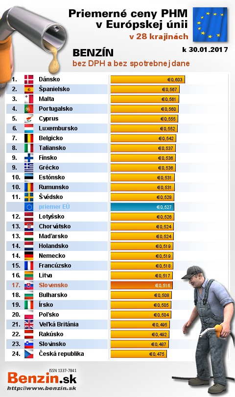 Na Slovensku sme tankovali 8. najlacnejší benzín bez dane v EÚ za priemernú cenu: 0,516 EUR za 1L.