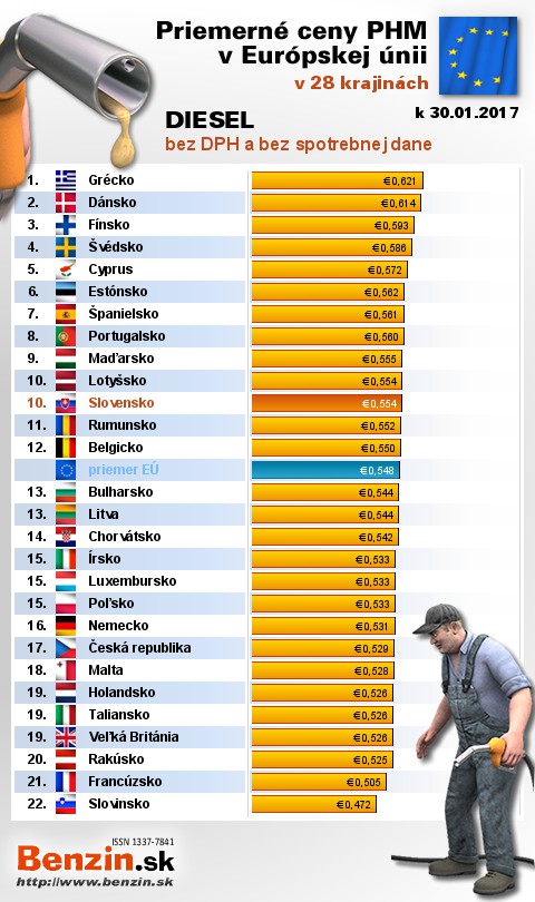 Na Slovensku čerpali motoristi 13. najlacnejšiu motorovú naftu bez dane v rámci Európy: 0,554 EUR za 1L.