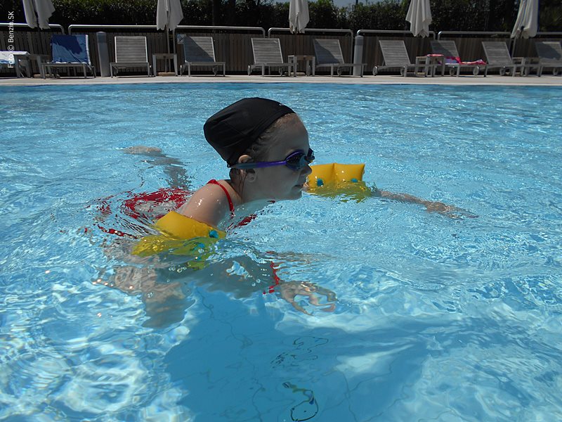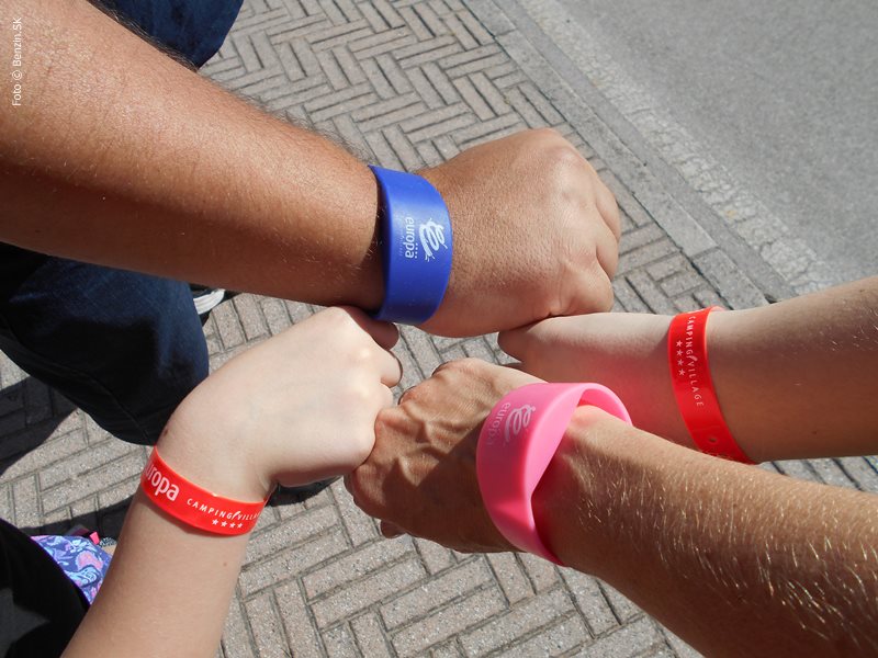 Hneď na recepcii sme dostali na ruku náramky, ktoré nás oprávňovali využívať všetky služby kempu. Dospelí majú náramky s elektronickými čipmi, ktoré okrem vstupov do kempu a vodného sveta umožnia "dobitie eurami". To znamená, že sme v centrálnej pokladni vložili určitú sumu do depozitu, a potom v kempe pri bazéne, pri mori, v reštauráciách sme nemuseli mať pri sebe hotovosť, stačilo priložiť elektronický náramok, z ktorého sa odpočítavala suma. Bolo to veľmi pohodlné, nemuseli sme sa pri vode starať o peňaženku.
