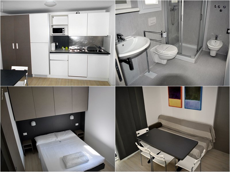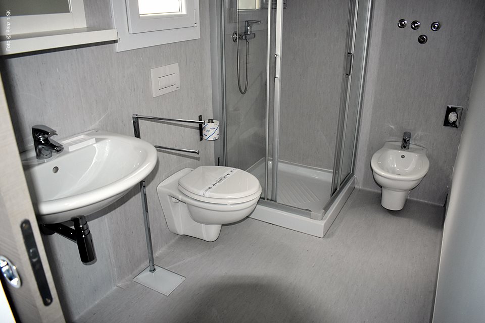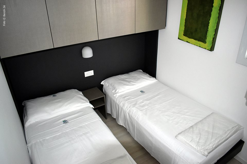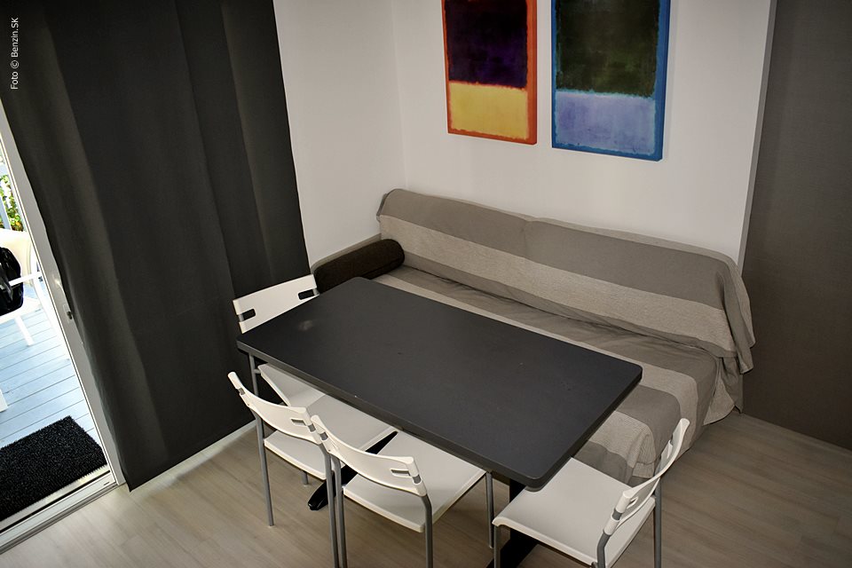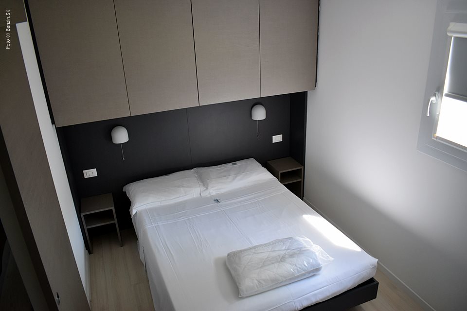 ![]() Ubytovanie Ecolife Unit, Camping Village Europa**** (c) Benzin.SK Ubytovali sme sa v domčeku Ecolife Unit. Je veľkoryso riešený, má vlastnú terasu so stolom a stoličkami, kde sme veľmi radi raňajkovali. Dovnútra sa vchádza cez obývačku, kde je kuchynská linka s plnohodnotnou výbavou (riady, taniere, príbory, hrnce, sporák, umývačka, chladnička,...), stolom, stoličkami, sedačkou, televízorom a klimatizáciou. Z obývačky sa ide do ďalších miestností - kúpeľne a dvoch izieb. Jedna izba je dvojlôžková a druhá je s manželskou a ešte ďalšou samostatnou posteľou. Sú pekne a účelne zariadené, s nočnými stolíkmi, skrinkami, vešiakmi,... Kúpeľňa je kráľovsky veľká, je tu sprchový kút a je spojená s toaletou a bidetom. Na každom jednom okne je okrem rolety aj sieťka proti hmyzu, aj na vchodových dverách. ![]() Ubytovanie Ecolife Unit, Camping Village Europa**** (c) Benzin.SK Keďže je v blízkosti benátska lagúna, komárov je tu večer veľa. Preto nás sieťky nesmierne potešili. Uteráky a posteľné návlečky boli k dispozícii, rovnako aj rolka toaletného papiera. Celkovo Ecolife pôsobí vzdušne, priestranne. Medzi každým domčekom v uličke je živý plot, ktorý tvorí nielen prirodzený tieň, ale poskytuje aj dostatok súkromia. ![]() Krásna pláž (c) Benzin.SK