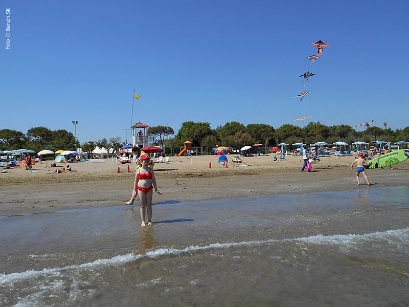 More i pláž sú čisté, piesčité, dajú sa tu prenajať ležadlá so slnečníkom. Samozrejme, môžu sa priniesť aj svoje slnečníky, či deky. Chodievali sme veľmi často do Bibione, lebo sa tam deťom páčilo - pláž, more, večerná promenáda... My sme si tiež už celkom zvykli, veď čo by človek neurobil pre deti? Veľmi príjemne nás prekvapilo toto miesto. Bolo tu len pár radov slnečníkov, žiadna masovka. Deku sme si mohli dať až celkom k moru. Hoci je tu pieskové dno, more nebolo zakalené, aj vo väčšej hĺbke sme krásne videli na dno. Už v máji malo komfortnú teplotu 22 stupňov. Na pláži bolo tisíce nádherných mušlí, takže ich zbieranie a pozorovanie malých krabíkov, či stavanie hradov z piesku zaberie deťom veľa času. A ak by chceli okrem kúpania ešte ďalšiu zmenu, môžu sa zabaviť na trampolíne, preliezačkách a šmykľavkách, ktoré sú hneď na pláži. Bolo tu krásne, aj naše deti ostali očarené a veľmi rýchlo prišli na chuť krásnemu prostrediu Cavallina.