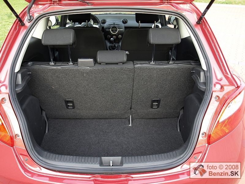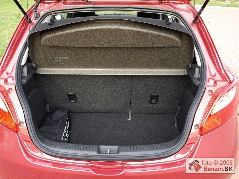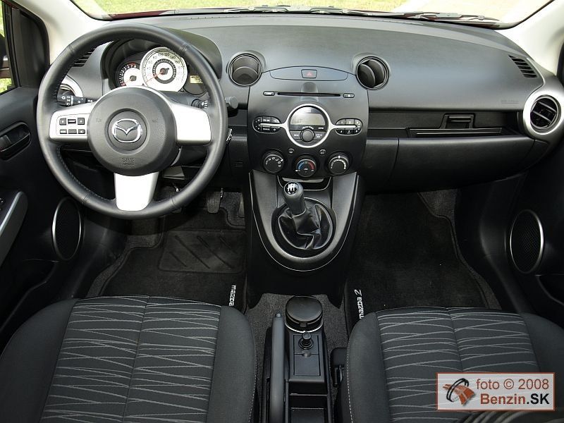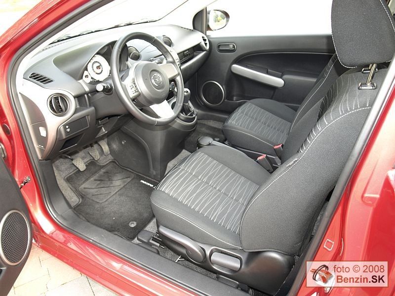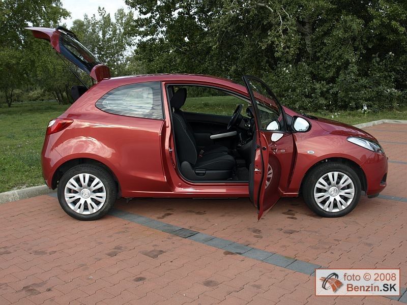 Trojdverová karoséria nesie rovnako atraktívne krivky, ako jej päťdverový vzor. Pôsobí však dynamickejšie, čo dodáva automobilu ešte viac na šarme. Rozmerné, pretiahnuté svetlomety usmievavá maska, to všetko ostalo. Zachovali sa aj navlas rovnaké vonkajšie rozmery karosérie. Podobne aj interiér bol pre nás už dobre známy. Cítili sme sa v ňom príjemne. Znovu sme sa vyskúšali skrinku pred spolujazdcom, ktorá má v odklápacích dvierkach otvor, kam sa dá bez ich otvorenia zasunúť dokumentácia alebo automapa a podobne. Multifunkčný volant má, ako pri päťdverovej verzii, len výškové nastavovanie. Materiály použité v interiéri sú kvalitné. Prístrojový panel ostal nezmenený, všetky ovládacie prvky sú veľmi dobre dostupné. Vo výbave nechýbala automatická klimatizácia, či znovu zlodejom odolné rádio. Jeho tvar a najmä rozmer ladí len s interiérom Mazdy 2. Takže zlodeji ho do iných automobilov nemajú dôvod kradnúť. V kufri sme našli rezervné koleso určené na núdzový dojazd.