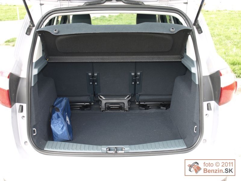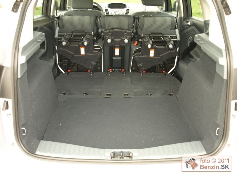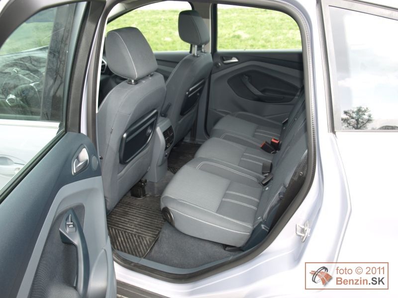 Počas dňa je táto sieť skoro neviditeľná, v noci láme trochu inak svetlo, a zadalo sa nám, že nás protiidúce autá aj menej oslňovali. Z vybavenia spomeňme ešte dažďový senzor, automatickú klimatizáciu, autorádio s Bluetoth a USB, tempomat, štartovanie tlačidlo, či cúvacie senzory, hrdlo nádrže bez zátky. Z hľadiska bezpečnosti je to užitočný systém BLIS – optická signalizácia vozidla vo vašom mŕtvom uhle a prídavné zrkadielko, povedzme na sledovanie ratolestí na zadnom sedadle počas jazdy. Keďže C-Max je stavaný, ako rodinný van, dostatok priestoru je aj na zadných sedadlách. Dve bočné sú trochu širšie, ako stredné, a sú posuvnú. Všetky tri sa dajú ľahko sklápať. Priestoru na kolená, aj nad hlavami je tu naozaj dostatok. Ak sa rozhodnete zadné sedadlá vybrať z auta, vznikne naozaj veľkorysý priestor, ktorý už úspešne zápasí aj s priestorom dodávkových automobilov.