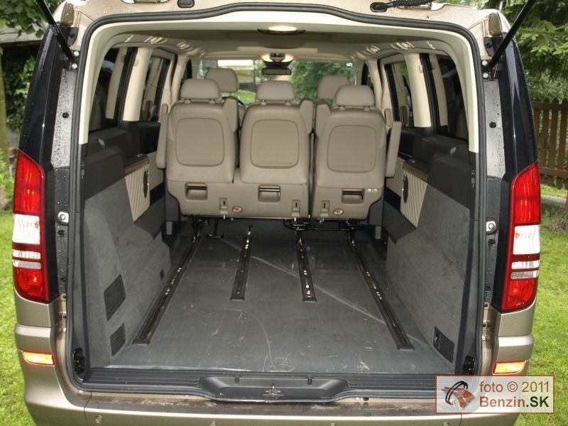Treba dodať, že Viano sa dodáva aj dvomi typmi kratších karosérií. Keďže sme mali najväčšiu, oddávali sme sa jej priestorovým možnostiam, a tie sú ohromné. Na batožinu aj za tretím radom sedadiel je k dispozícii skoro jeden meter kubický. Nestačí? Sedadlá sa dajú ľahko vybrať z automobilu. Nuž ľahko idú tie tretinové. Dvojité sú už pre jedného príliš ťažké, potrebujete ešte jeden pár rúk. No potom sa Viano zmení na "telocvičňu" s viac ako štyri a pol metrami kubickými priestoru, kde nezavadzia ani rezerva. Tá je umiestnená pod automobilom, zvonku, hneď za poháňanou zadnou nápravou. Prístup cez bočné posuvné dvere je dobrý aj na tretí rad sedadiel. Nastupuje sa do výšky, takže problémy nemajú ani pasažieri s boľavými krížami.