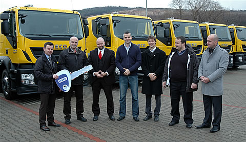 Na snímke z oficiálneho odovzdávania vozidiel sú (zľava): Ing. Vladimír Penxa, market manažér v Iveco Slovakia s r.o., László Bagó, Ing. Tomáš Rychetský, obchodný riaditeľ sekcie Automotive v AGROTEC a.s., Krisztián Godó, integrated technical manager v SLOVNAFT TRANS a.s., Ing. Martin Grunský, technický vedúci v SLOVNAFT TRANS a.s., Ing. Norbert Nagy, prokurista SLOVNAFT TRANS a.s. a Ing. Ladislav Lomnický, manažér predaja vozidiel ťažkého radu v Iveco Slovakia s.r.o.